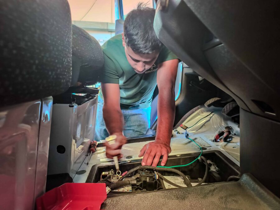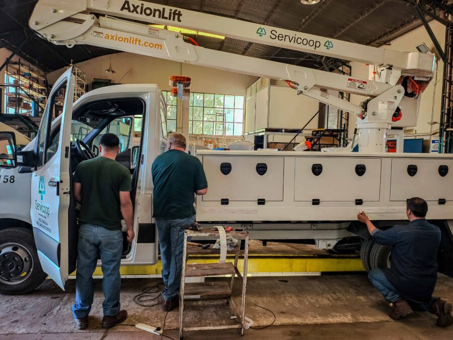 Al ingresar un nuevo móvil a la flota automotriz de Servicoop, nuestro personal debe realizar diversas adecuaciones y modificaciones para adaptarlo a la prestación de servicios. El equipo del taller mecánico realiza la instalación de balizas de emergencia, bocinas de reversa, elementos de seguridad y diferentes accesorios, mientras que el personal de Herrería debe ejecutar modificaciones, según los distintos requerimientos técnicos o de seguridad que correspondan.