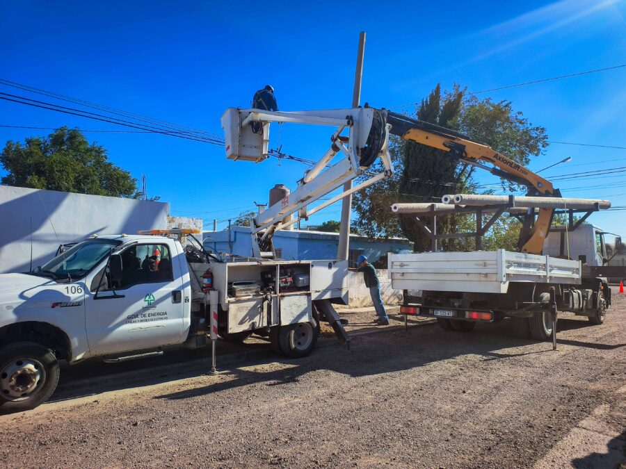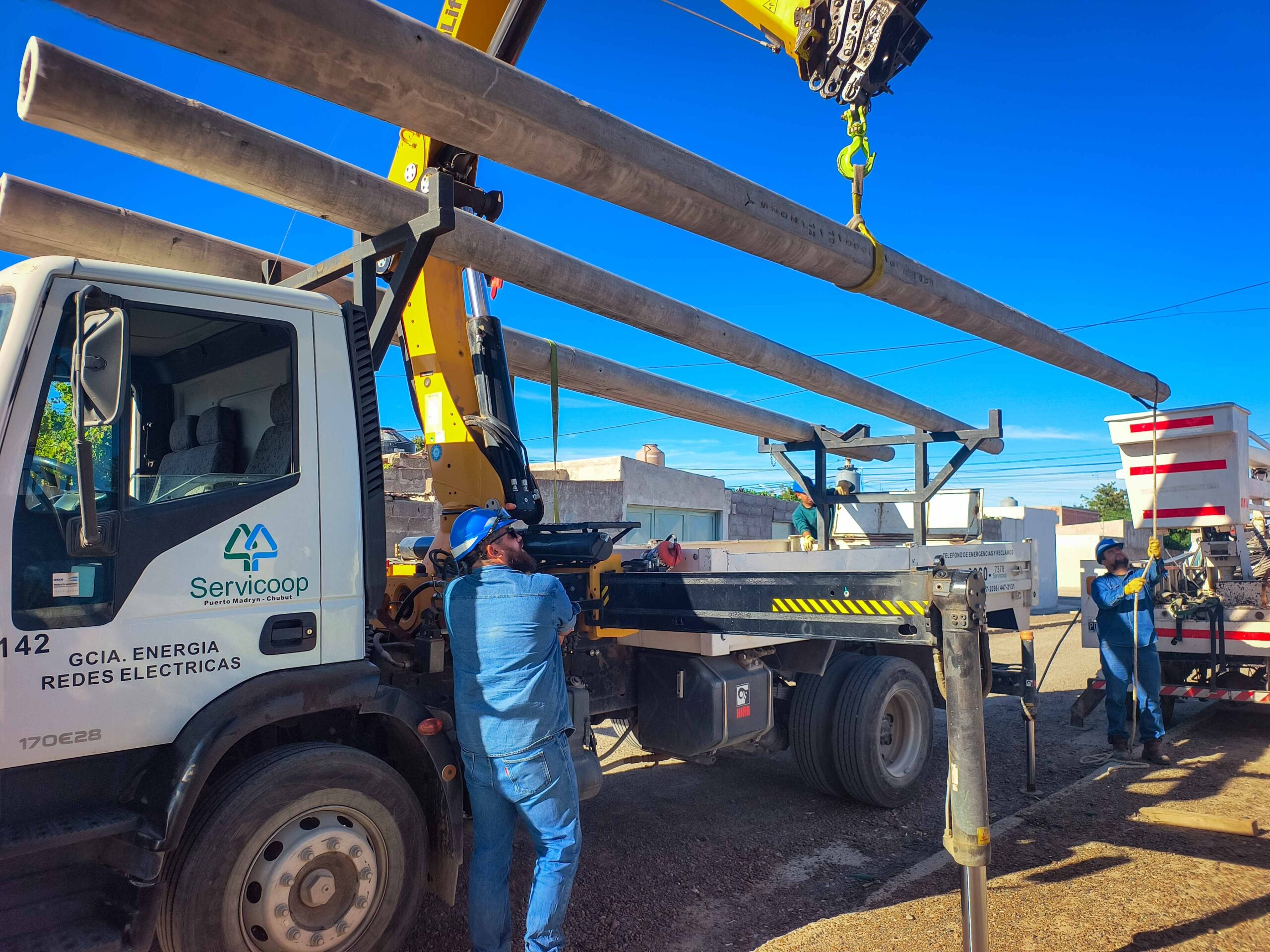 Nuestro personal de energía continúa con la instalación de nuevas columnas de hormigón en distintos puntos de la ciudad. Estas obras obedecen al plan de modernización del tendido eléctrico que se ejecuta en puntos estratégicos del sistema, con el fin de robustecer la infraestructura eléctrica. En esta oportunidad se realizó la obra sobre Camarones entre Juan de la Piedra y Necochea.