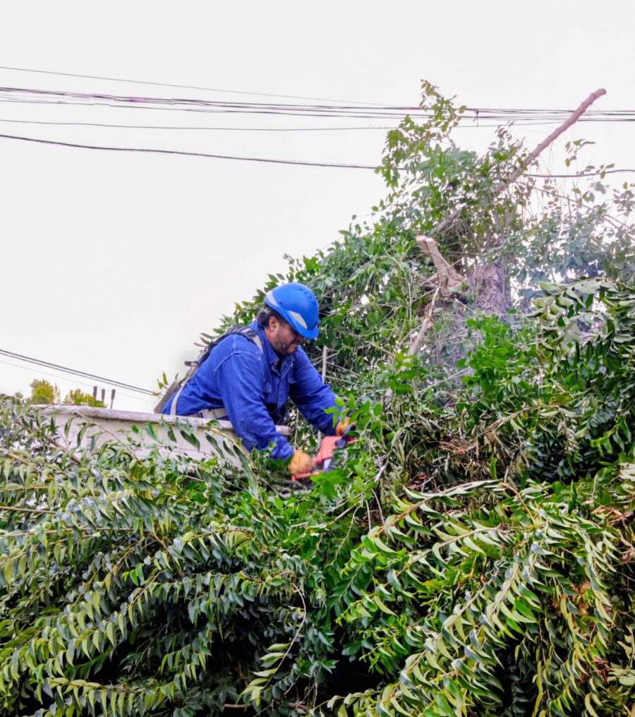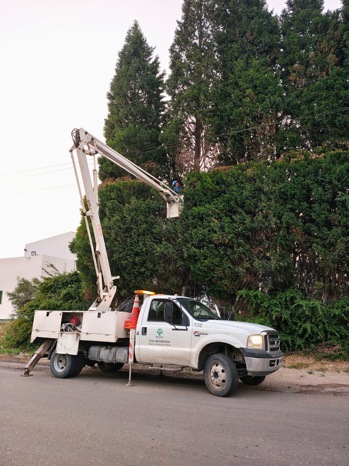 La vegetación existente es responsabilidad de los frentistas. Son ellos lo que deben arbitrar los medios para que las ramas no alcancen el espacio de seguridad de las redes de energía. La Cooperativa interviene cuando la vegetación ya invadió el espacio y pone en riesgo la prestación del servicio. Durante los temporales de viento más de 80% de los reclamos de los usuarios por fallas o falta de suministro obedece a esta circunstancia. En esta oportunidad el equipo de redes realizó tareas de despeje aéreo sobre distintas arterias del parque industrial pesquero de la ciudad.