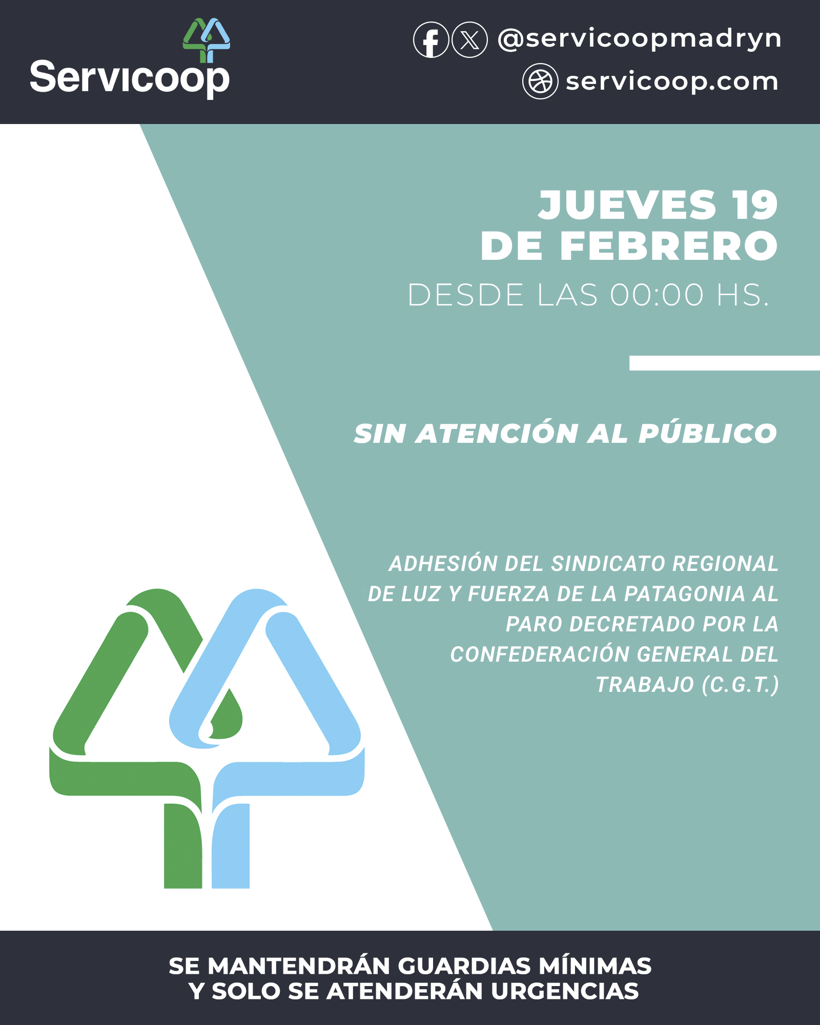 Informamos a la comunidad que mañana jueves 19 de febrero, nuestras oficinas permanecerán cerradas, debido a la adhesión del Sindicato Regional de Luz y Fuerza de la Patagonia al paro decretado por la Confederación General del Trabajo (C.G.T.) Se mantendrán en operaciones las guardias técnicas mínimas y solo se atenderán urgencias.